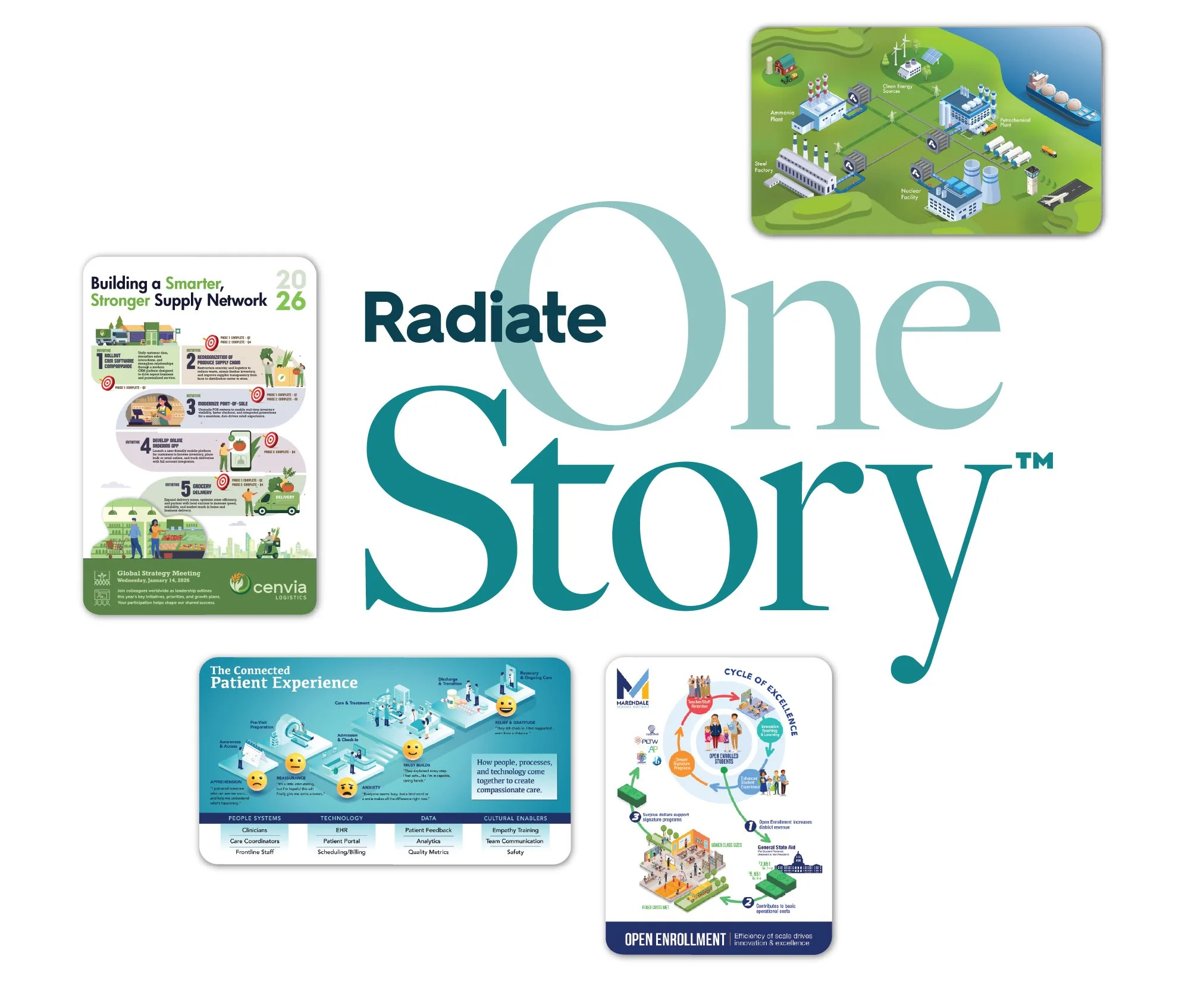 Radiate’s OneStory service helps clients create clear, strategic visual narratives for critical and complex stories. Instead of relying on bulky presentations, it delivers concise visuals—such as a single page, poster, or slide—to communicate key messages effectively. The service also provides expert guidance to focus your story and enhance communication across multiple platforms.